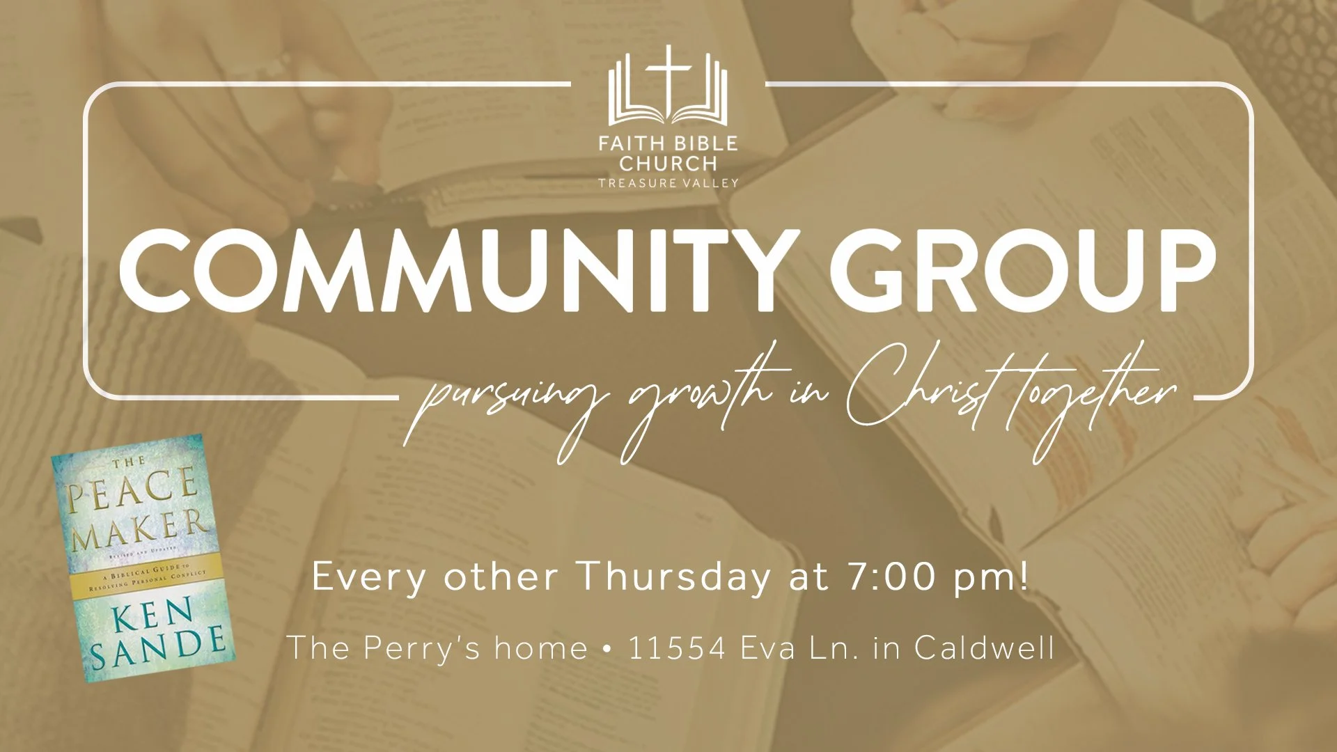 Community Group Thursday, April 9, 2026 7:00 PM 8:00 PM 11554 Eva Lane Caldwell, ID, 83607 United States (map) Google Calendar ICS